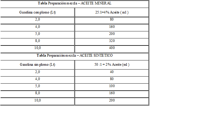 - Aceite mineral, mezclado con gasolina con plomo en un 4% (25:1)